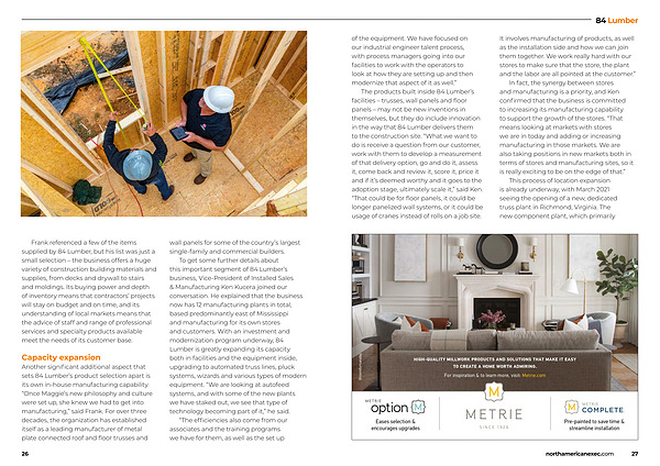 wall panels for some of the country ’ s largest single-family and commercial builders . To get some further details about this important segment of 84 Lumber ’ s business , Vice-President of Installed Sales & Manufacturing Ken Kucera joined our conversation . He explained that the business now has 12 manufacturing plants in total , based predominantly east of Mississippi and manufacturing for its own stores and customers . With an investment and modernization program underway , 84 Lumber is greatly expanding its capacity both in facilities and the equipment inside , upgrading to automated truss lines , pluck systems , wizards and various types of modern equipment . “ We are looking at autofeed systems , and with some of the new plants we have staked out , we see that type of technology becoming part of it ,” he said .