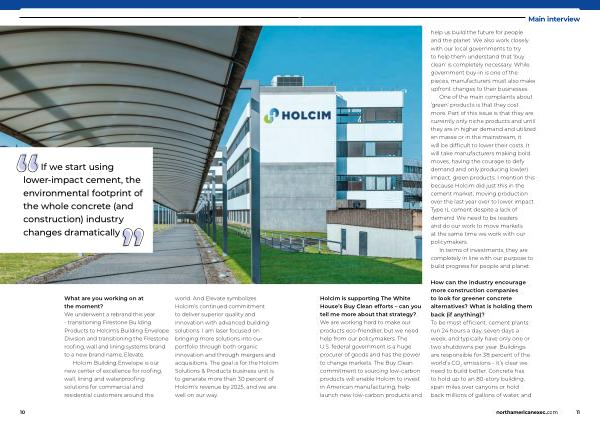 Holcim is supporting The White House ’ s Buy Clean efforts – can you tell me more about that strategy ? We are working hard to make our products eco-friendlier , but we need help from our policymakers . The U . S . federal government is a huge procurer of goods and has the power to change markets . The Buy Clean commitment to sourcing low-carbon products will enable Holcim to invest in American manufacturing , help launch new low-carbon products and